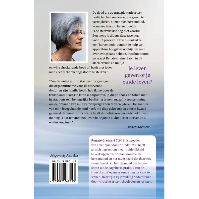 De dood die de transplantatieartsen nodig hebben om levende organen te verwijderen, noemt men hersendood. Wanneer iemand hersendood is, is de stervensfase nog niet voorbij. Een mens is tijdens deze fase nog voor 97 procent in leven ook al zal een `hersendode zonder de hulp van apparatuur hoogstwaarschijnlijk geen overlevingskans hebben. Desalniettemin, zo vraagt Renate Greinert zich in dit alarmerende en bij tijd en wijle shockerende boek af: heeft niet ieder mens het recht om ongestoord te sterven?