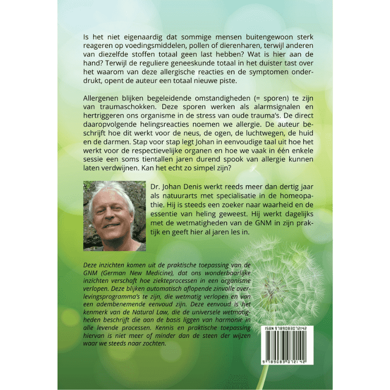 Allergenen blijken begeleidende omstandigheden (= sporen) te zijn van traumaschokken. Deze sporen werken als alarmsignalen en hertriggeren ons organisme in de stress van oude trauma’s. De direct daaropvolgende helingsreacties noemen we allergie. De auteur beschrijft hoe dit werkt voor de neus, de ogen, de luchtwegen, de huid en de darmen. Stap voor stap legt Johan in eenvoudige taal uit hoe het werkt voor de respectievelijke organen en hoe we vaak in een enkele